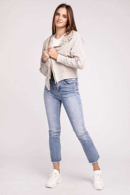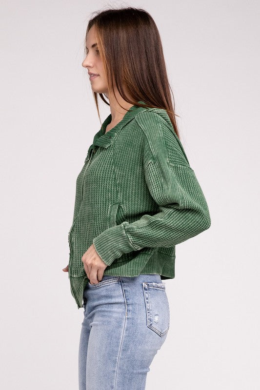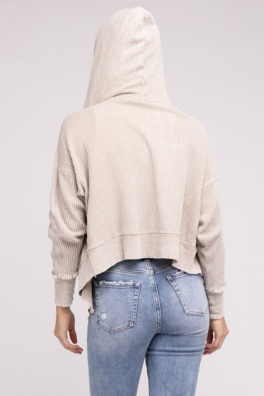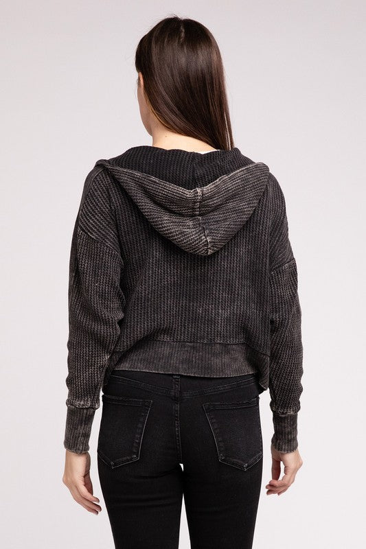 Introducing our Acid Wash Cotton Waffle Hooded Zip-Up Jacket, a versatile and stylish addition to your wardrobe. This jacket exudes a laid-back yet trendy vibe. The slouchy hood adds a relaxed touch, while the hidden zip-up and three-snap button closure provide a sleek and secure fit. With practicality in mind, this jacket features pockets for added convenience.
