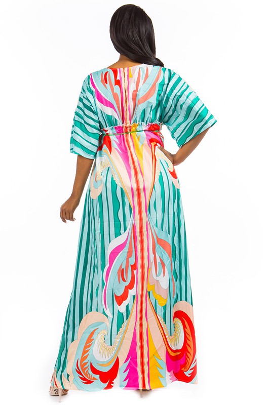 This maxi summer dress features 3/4 length sleeves, a flattering V-neckline, and an elasticized waist for a comfortable fit. The design includes a stylish front detail that enhances its elegant silhouette.
