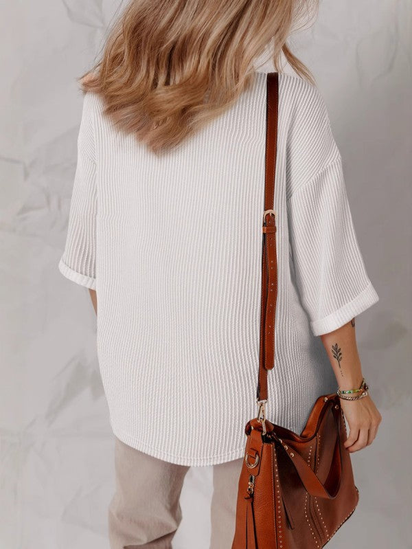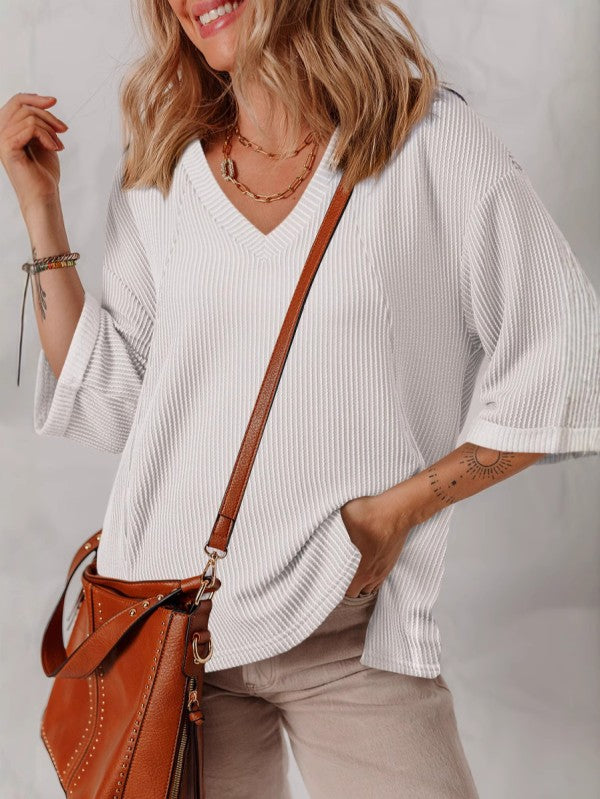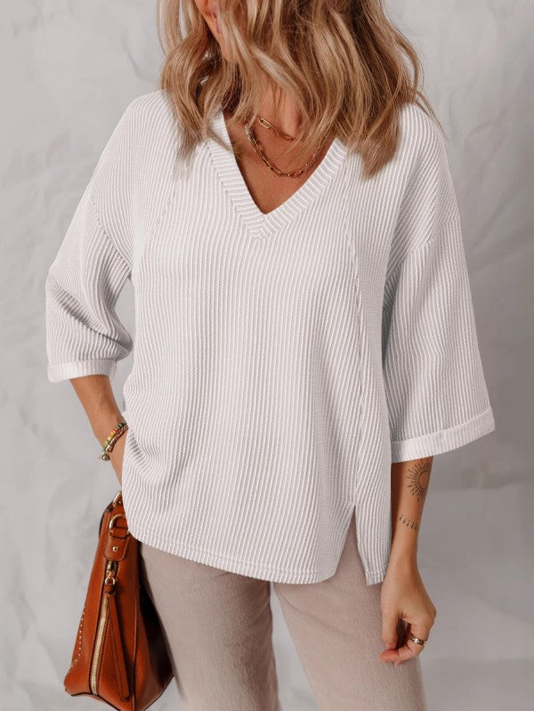 It features a v neck, drop shoulder, 3/4 sleeves with folded cuffs.