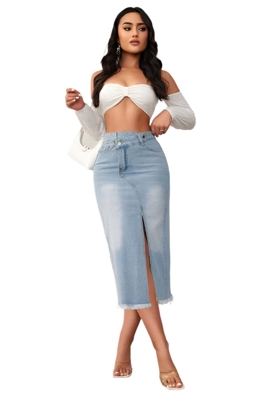This midi denim skirt features an asymmetric zip fly complemented by a two-button closure, creating a distinctive open-side design.