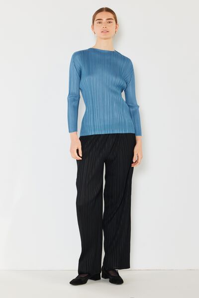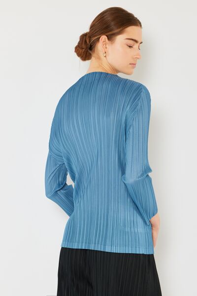 The pleated long sleeve boatneck top is a sophisticated and versatile addition to any wardrobe. The pleats add an elegant and stylish detail to the classic boatneck neckline. With long sleeves, this top is perfect for transitioning between seasons. The boatneck design offers a flattering and timeless silhouette. This top can be paired easily with jeans for a casual look or dressed up with trousers for a more polished outfit. Overall, the pleated long sleeve boatneck top is a chic and versatile choice for a variety of occasions.