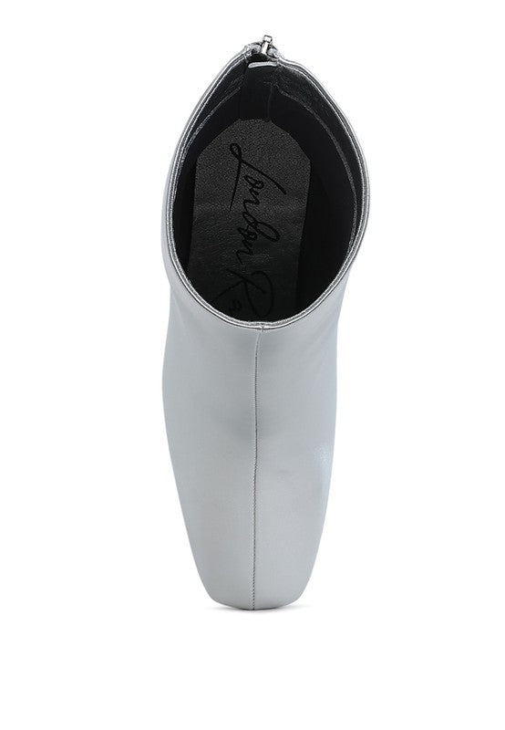 Inspired by the groovy curves and statement heels of the '70s, our ankle boots are here to get 'em talking. Stacked up on a flared block heel and imagined in metallic faux leather, this above-the-ankle pair with back zipper closure easily hot-foots its way with bold mini dresses and classic denim.