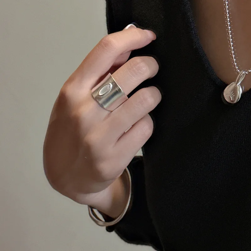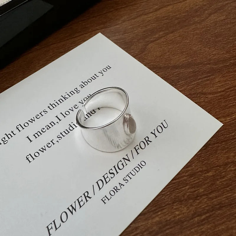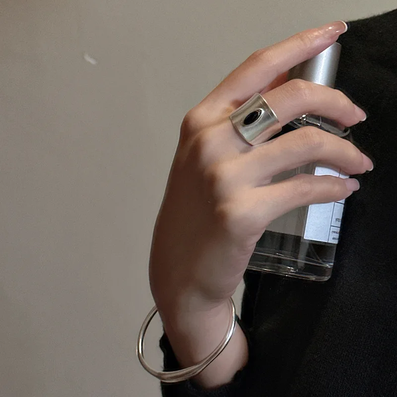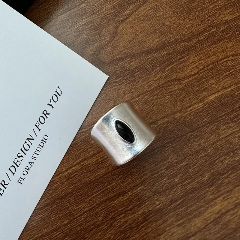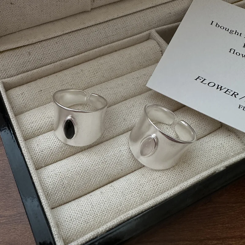 925 Sterling Silver Black White Agate Inlay Wide Round Chunky Ring