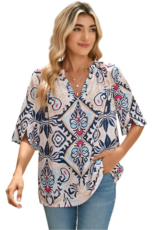 Discover the grace of this blouse with its intricate Boho-inspired design, perfect for a sophisticated and stylish look.