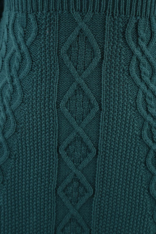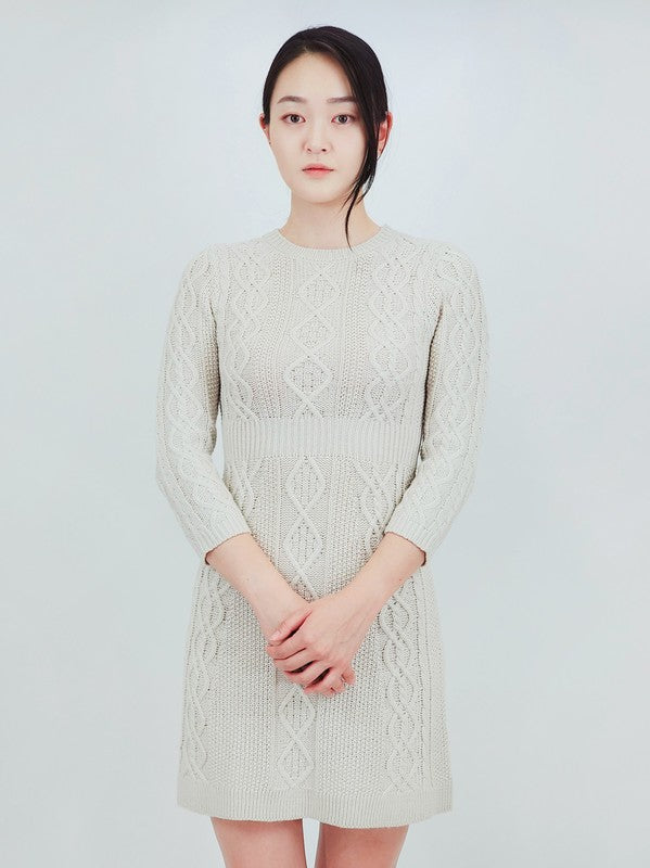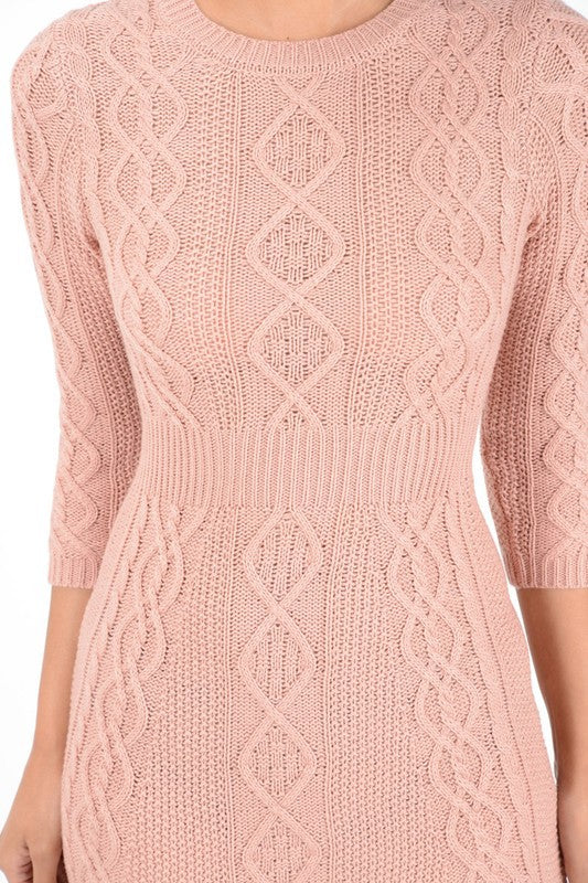 - Cable Knitted, Round Neck, 3/4 Sleeves, Ribbed Pointed Mini Sweater Dress.