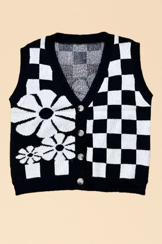 *Exclusive In-House Design*-Checkered and flower intarsia-Button front-V neck-All original design