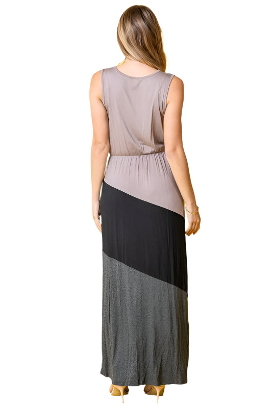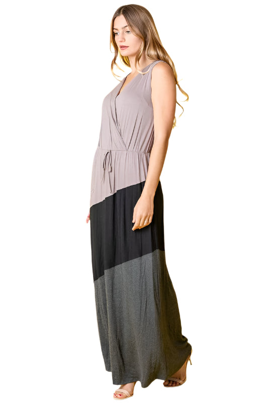This Plus-size maxi dress features a color block design with a surplice neckline and an elastic waistband for a comfortable, flattering fit.