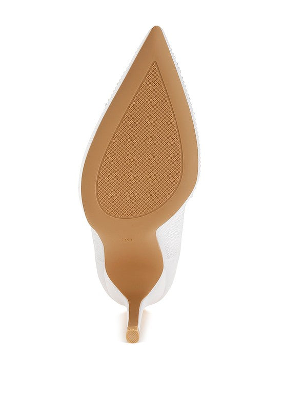 Meet the exquisite rhinestone-embellished pumps, bound to create a sizzling, spellbinding impression. The pumps feature tall stiletto heels, a closed pointed toe for added drama and plush cushion insoles for extra comfort. Ideal for parties, weddings, and romantic date nights.