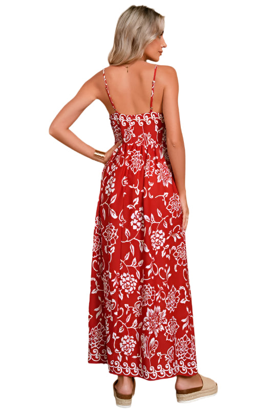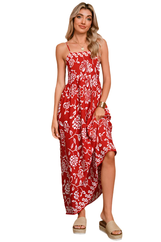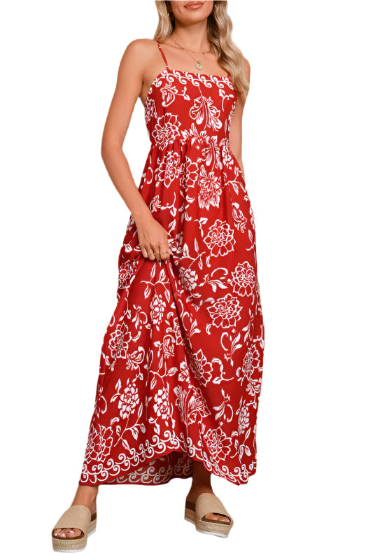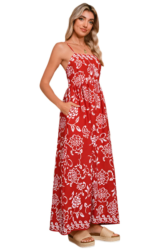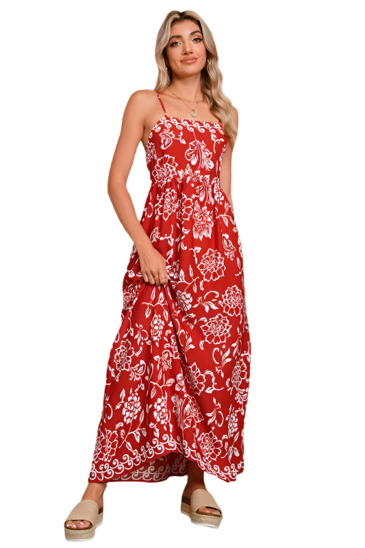 This maxi dress features a red floral pattern with delicate spaghetti straps and an empire waist, combining elegance with a flattering silhouette.