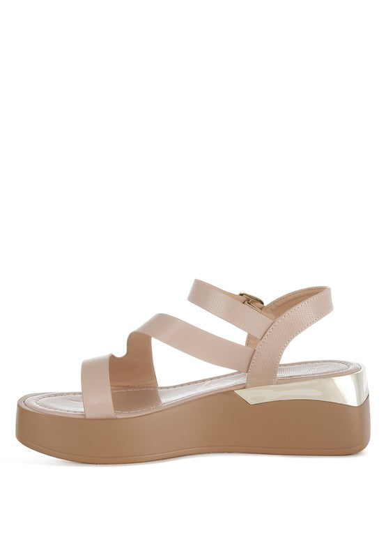 The sandals are a summer favorite with the chunky flatforms and the embossed faux leather upper which gives it a chic look. The pin buckle fastening ensures a secure fit and the metallic accent elevates the visual aesthetic of the sandals.