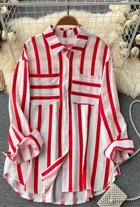 Striped buttoned up shirt -Long Sleeve -Button Front Blouse -Pocket