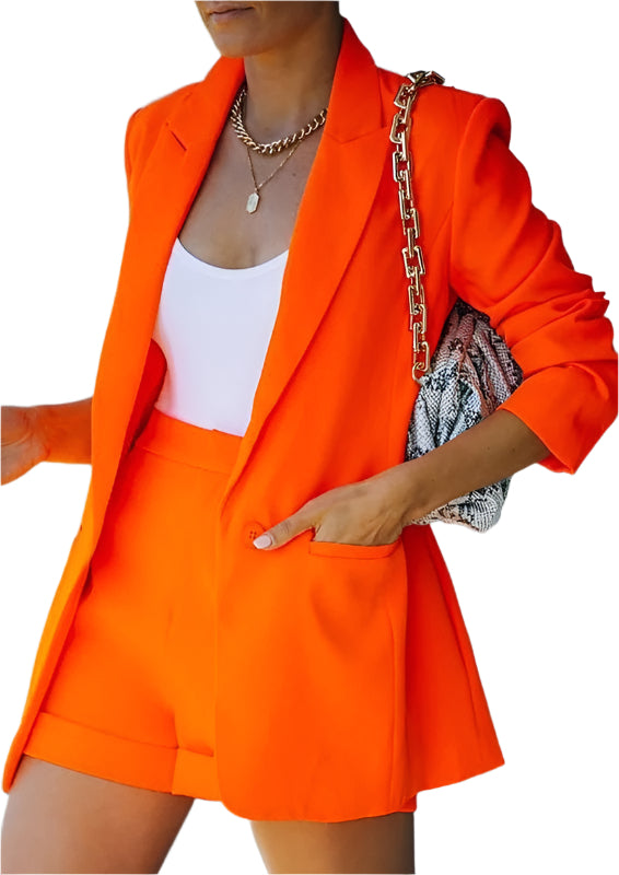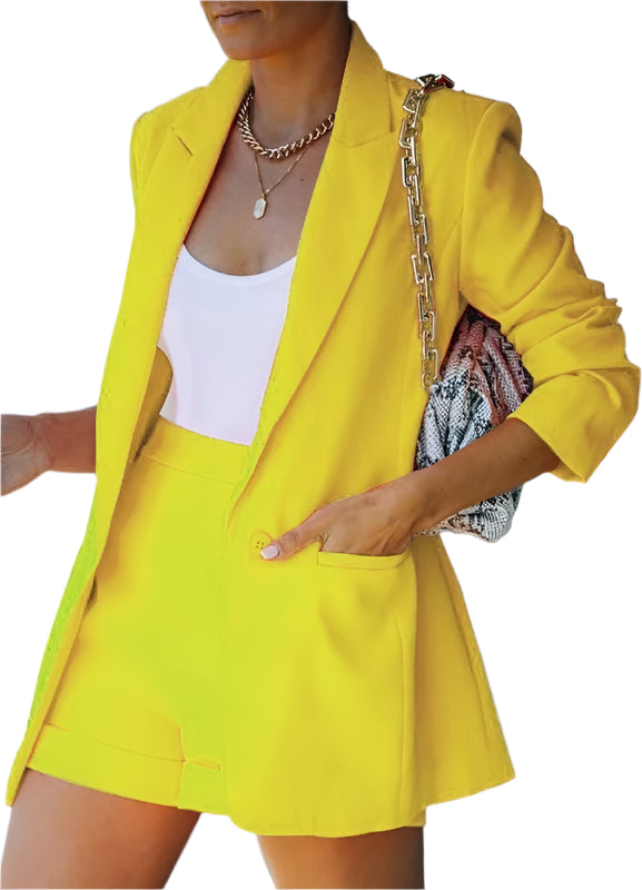 This set features a coordinated two-piece design, combining a tailored blazer with matching shorts for a polished and versatile look.