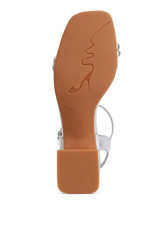 Presenting sandals with a stylish metallic finish and fashionable ankle straps, complemented by low block heels-perfect for comfortable all-day wear.